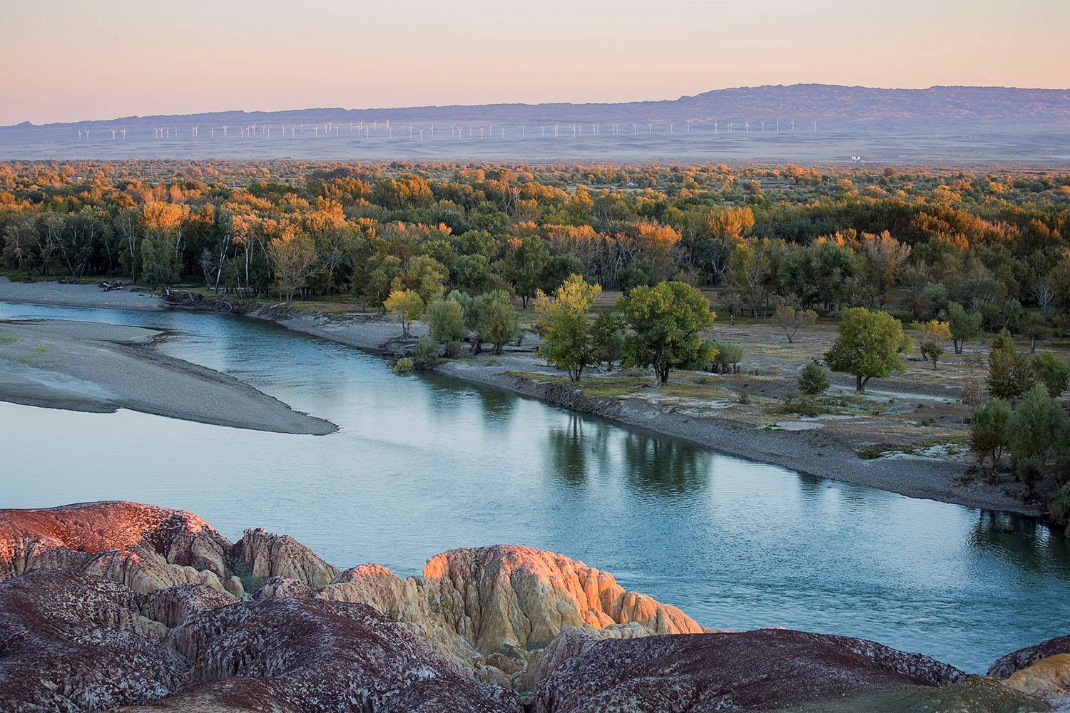 它毗鄰碧波蕩漾的額爾齊斯河,與對岸蔥郁青翠的河谷風(fēng)光遙相輝映,可謂“一河隔兩岸,自有兩重天”。激猛的河流沖擊以及狂風(fēng)侵蝕,形成了北岸的懸崖式雅丹地貌,河岸巖層抗風(fēng)化能力強(qiáng)弱不一,輪廓便會參差不齊,而巖石含有礦物質(zhì)的不同,又幻化出種種異彩,因此得名“五彩灘”。而南岸卻是綠樹葳蕤,連綿成林,遠(yuǎn)處逶迤的山巒與戈壁風(fēng)光盡收眼底。
