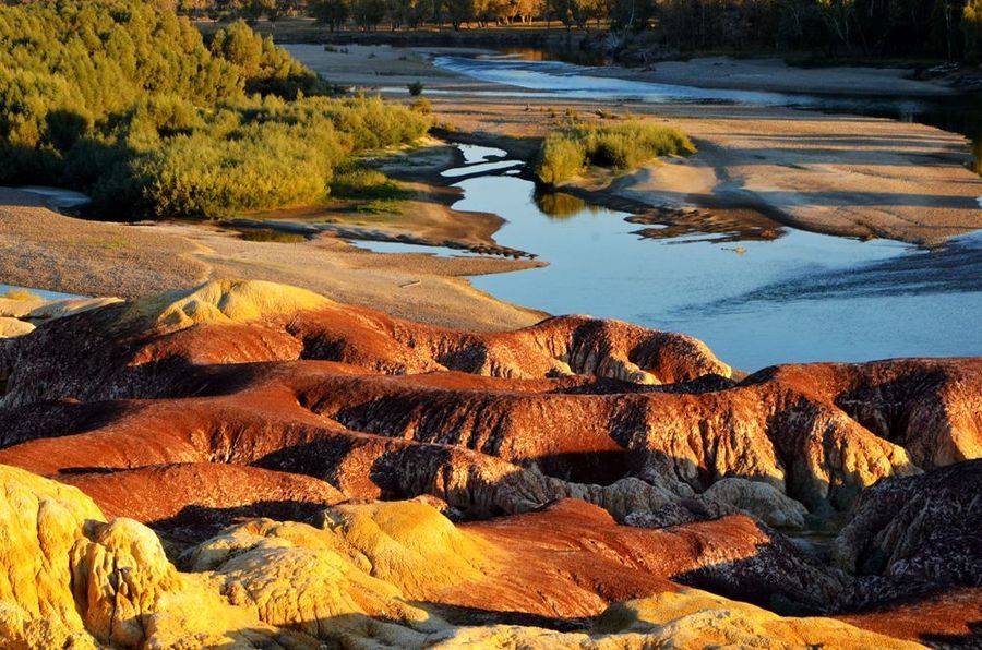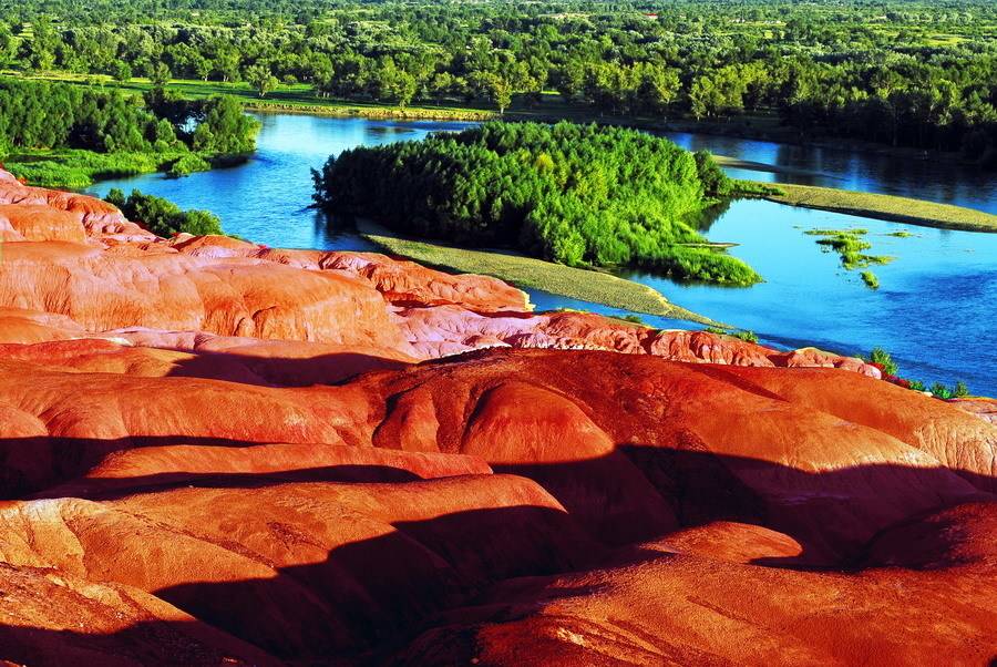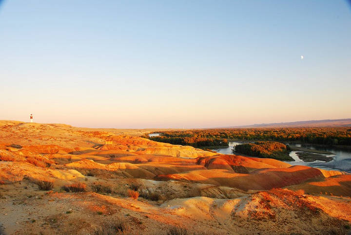 五彩灘的特別,還由于它色彩絢爛,形狀繽紛。因?yàn)檫@里有侏羅紀(jì)時(shí)代的煤層,經(jīng)過千萬年風(fēng)蝕雨剝以及河水的沖刷,在幾乎寸草不生的河灘上出現(xiàn)了紅、綠、紫、黃、棕等鮮艷的色彩。在河水的映襯和夕陽的照射下,當(dāng)你走進(jìn)這高低起伏的“ 丘陵 ”地帶,就如同走進(jìn)一個(gè)五彩斑斕夢幻般的世界,那些光怪陸離的色彩從四面八方撲面而來,都是那么明快、那么強(qiáng)烈、那么豐富多彩,真讓你感到目不暇接,眼花繚亂。