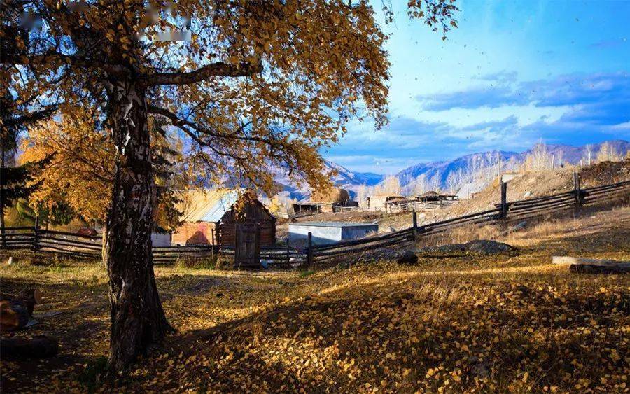 藍(lán)色的天、雪白的山峰、金黃的楊樹葉、火紅的樺樹葉,