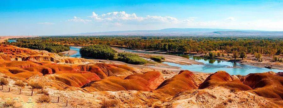 一岸碧水綠樹溫潤,一岸是懸崖式雅丹地貌火熱。