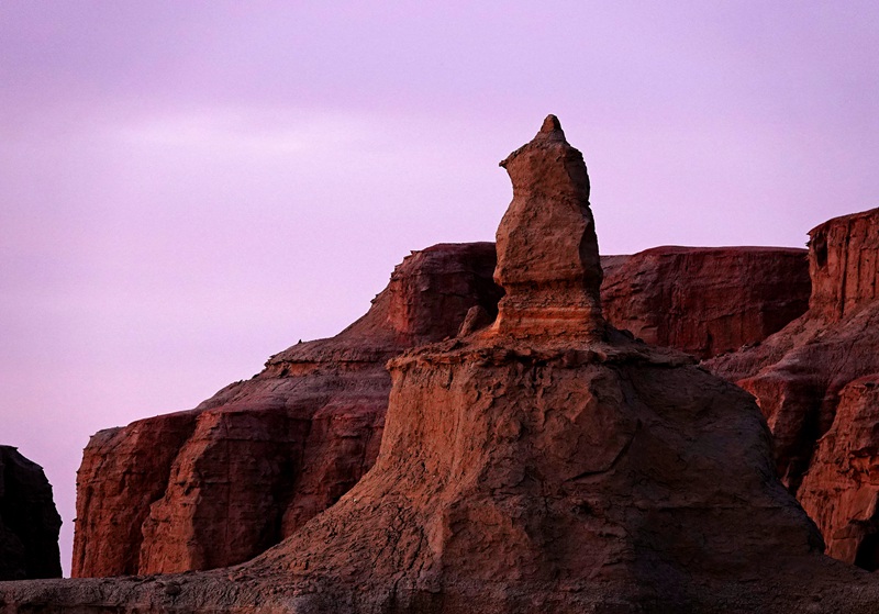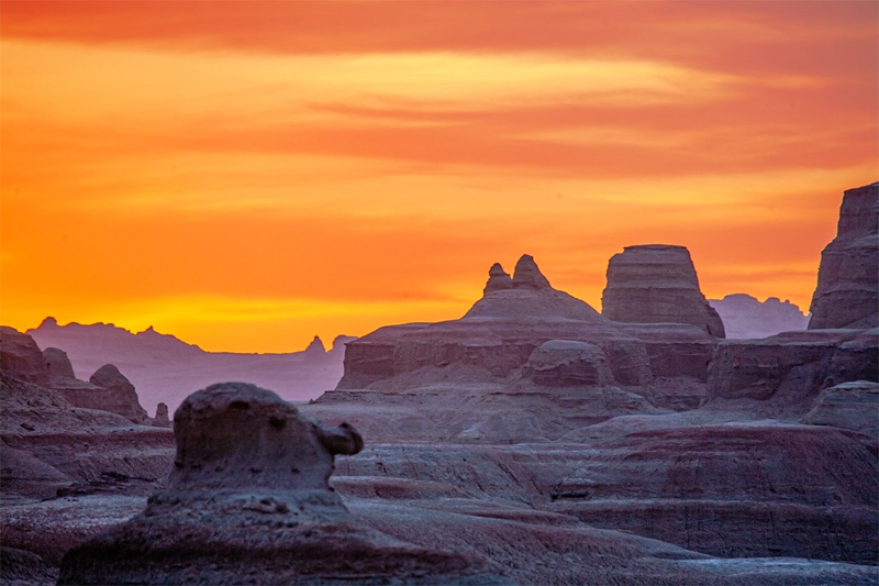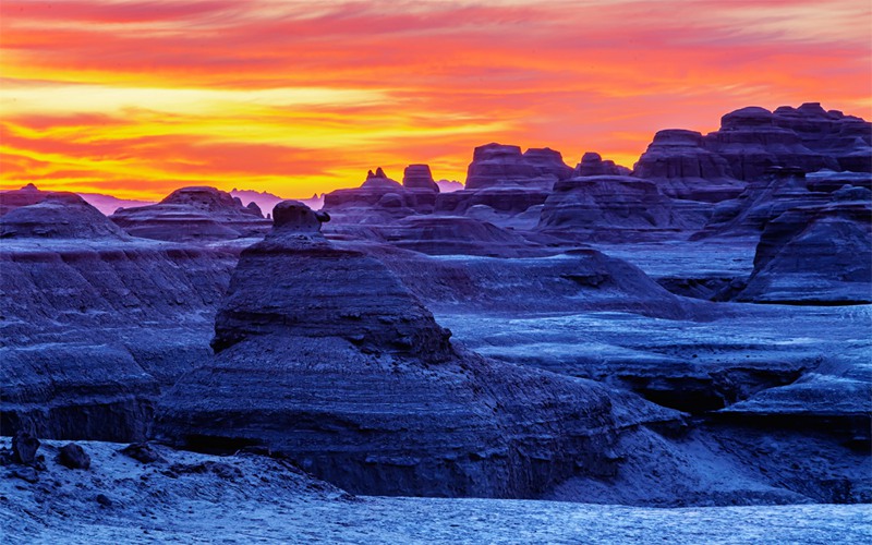千百萬年來,由于風(fēng)雨剝蝕,地面形成深淺不一的溝壑,裸露的石層被狂風(fēng)雕琢得奇形怪狀,有的像宮殿,有的像金字塔,有的像雄鷹展翅,千姿百態(tài),令人浮想聯(lián)翩。就連許多電影都把魔鬼城當(dāng)作了外景地,比如《臥虎藏龍》、《七劍下天山》就是在這里拍攝的。