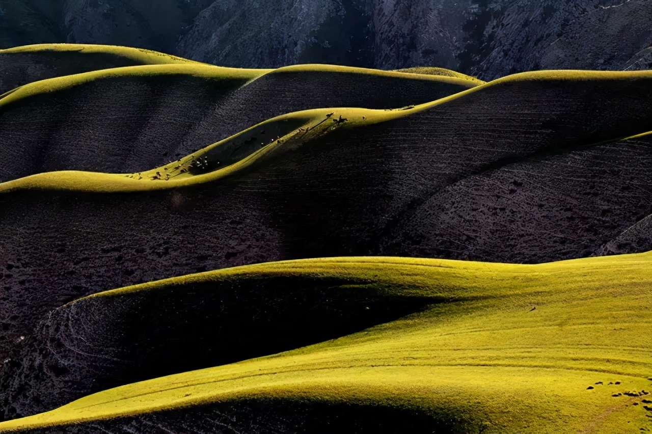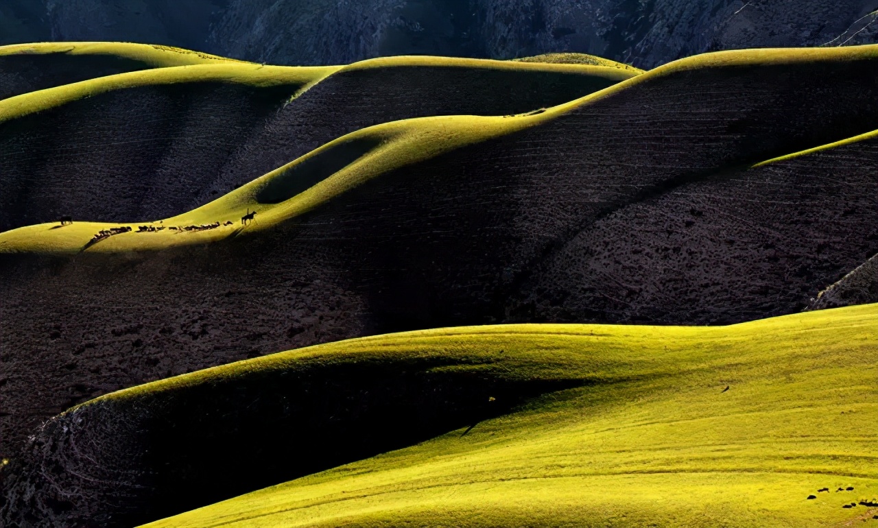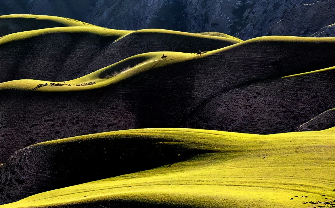 你以為這樣的喀拉峻已經(jīng)足夠美,不不,這些其他草原也有,不足為奇,下面才是獨一無二的驚艷!群山起伏成極富韻律的曲線,如大海掀起的層層波浪,為茫茫草原平添一份奇特動感的美,只一眼就震撼到失了言語。
