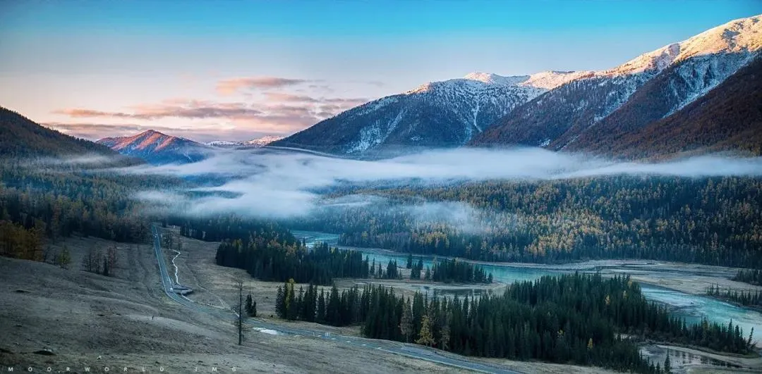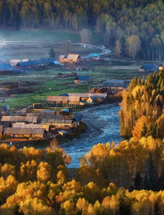 清晨的喀納斯薄霧籠罩 朝陽(yáng)初升